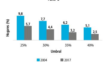 According to the 2004-2005 National Household Survey, 5.1% of Argentine households incurred catastrophic health expenses for the 40% threshold. That percentage dropped to 2.5% according to the 2017-2018 National Household Survey.