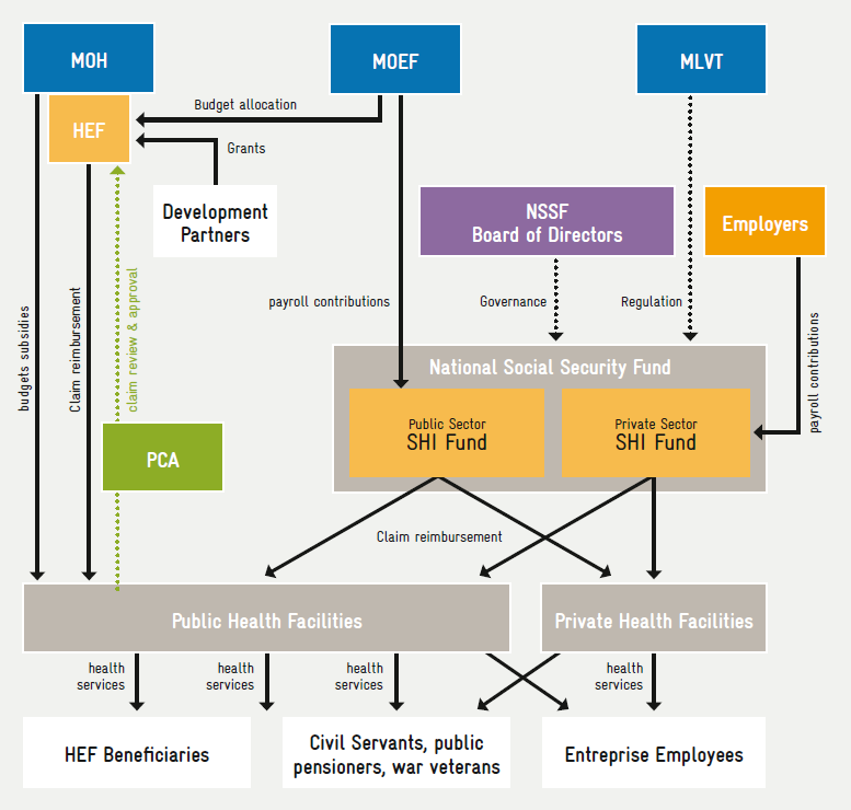 Governance is ensured by NSPC, which has matured since its recent inception. The NSPPF outlines the arrangements for a single purchaser under NSSF. The recently endorsed Law on Social Security, mainly formulated by MLVT –which NSSF is attached to – does not mention HEF, whereby it is not clear how this single purchaser will function. The private healthcare sector has no representative body, making communication challenging. Apart from registration, little control over this sector’s practices is exerted.