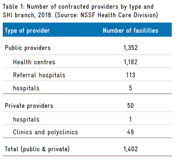 By the end of 2018, NSSF had contracted a total of 1,402 facilities, including 49 private clinics and polyclinics, and one private hospital (Table 1).