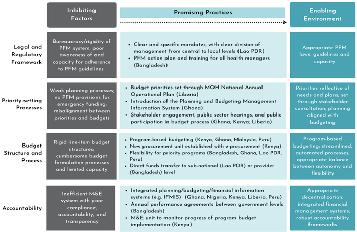 Los participantes en el intercambio de aprendizaje identificaron en primer lugar los factores clave que afectan a la ejecución del presupuesto sanitario. Estos factores, coincidieron, son 1) el marco jurídico y reglamentario de un país, 2) sus procesos de fijación de prioridades, 3) su estructura y proceso presupuestarios, y 4) sus mecanismos de rendición de cuentas. (Véase la primer blog de esta serie). A continuación, compartieron sus experiencias en la aplicación de prácticas pequeñas pero importantes para superar los cuellos de botella en estas cuatro áreas y pasar de un entorno inhibidor a uno propicio para la ejecución del presupuesto sanitario (Figura 1).