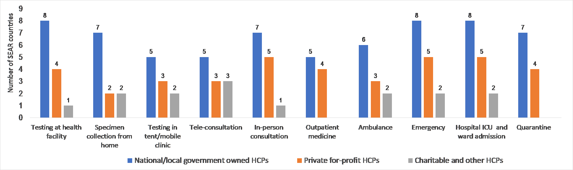Jusqu’à présent, la plupart des pays de la région de l’Asie du Sud-Est (SEAR) où des cas de COVID-19 ont été confirmés ont été observés dans des groupes. [De nombreux gouvernements de la région se sont appuyés sur des prestataires publics pour fournir les services de santé liés au COVID-19. Toutefois, à mesure que la situation évolue et que les pays enregistrent un nombre encore plus élevé de cas confirmés de COVID-19, les gouvernements pourraient être amenés à demander un soutien supplémentaire à un plus large éventail de parties prenantes, et notamment aux prestataires de soins de santé privés, qui sont très présents dans la prestation des services de santé dans la région. Le défi est d’autant plus grand que la capacité à réglementer le secteur privé de la santé n’a pas suivi dans la plupart des pays. [En général, il existe des variations considérables entre les pays de la région en ce qui concerne la fourniture de services de santé par le secteur privé, des pays comme le Bhoutan, la Thaïlande, le Timor-Leste et le Sri Lanka s’appuyant largement sur les prestataires du secteur public, tandis qu’au Bangladesh, en Inde et en Indonésie, environ 60 à 80 % des consultations externes et 40 à 60 % des cas d’hospitalisation sont assurés par le secteur privé. [Il est donc essentiel de disposer de politiques et d’approches efficaces en matière d’engagement du secteur privé pour gérer l’épidémie de COVID-19 dans chaque pays.
