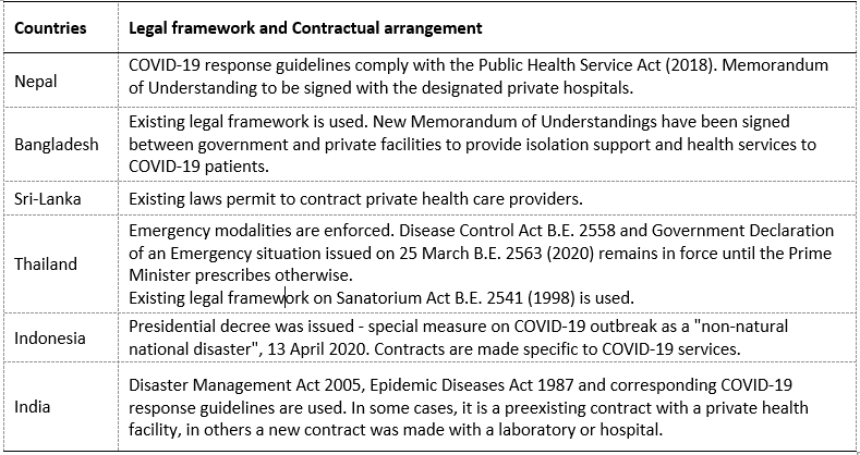 D’après les réponses à l’enquête, la plupart des gouvernements de la région ont appliqué les cadres juridiques existants pour engager des prestataires privés dans la réponse COVID-19 (tableau 1). Quelques pays, comme l’Indonésie et la Thaïlande, ont mis en place des modalités d’urgence pour mobiliser des capacités supplémentaires, par exemple en concluant des accords contractuels avec des prestataires de soins de santé privés pendant la période définie de l’épidémie de COVID-19.