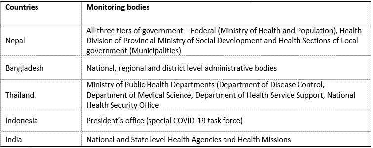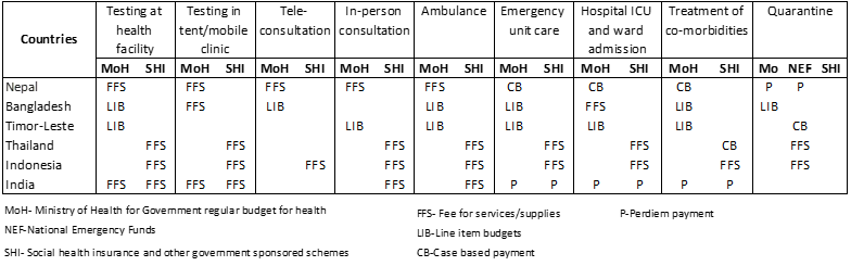 Selon les personnes interrogées, les ministères de la santé ont été les principaux coordinateurs et régulateurs de la réponse au COVID-19 liée au système de santé dans les pays de la région. Dans plusieurs pays, le ministère de la santé est également l’acheteur des services de santé privés, comme au Népal, au Bangladesh et au Timor-Oriental. Dans d’autres pays, les organismes publics d’assurance maladie jouent le rôle d’acheteurs de services COVID-19 auprès de prestataires publics et privés. C’est le cas, par exemple, de l’Office national de sécurité sanitaire (NHSO) de Thaïlande, du BJPS d’Indonésie et des autorités sanitaires nationales et étatiques en Inde. Pour les patients qui ne sont pas affiliés à un régime d’assurance maladie, le ministère de la santé et du bien-être familial[1] achète les services de santé nécessaires liés au COVID-19 en Inde, tandis que le BJPS en Indonésie est impliqué dans les fonctions d’examen et de vérification des demandes de remboursement.