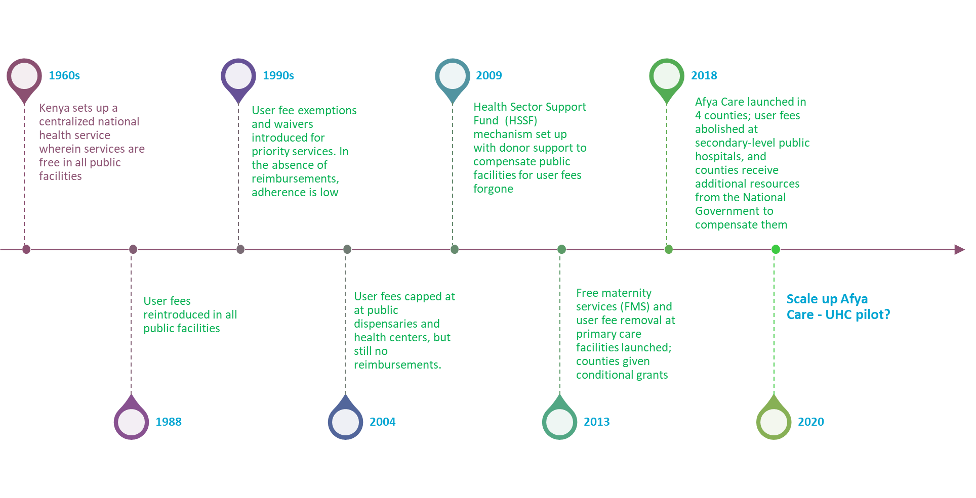 Avant que la pandémie n’éclate, le gouvernement national était prêt à étendre le programme de couverture sanitaire universelle Afya Care, qu’il a lancé dans quatre comtés en 2019. Dans le cadre du programme pilote, les quatre gouvernements de comté ont accepté de supprimer tous les frais d’utilisation dans les hôpitaux du secteur public. À la place, ils ont reçu des ressources supplémentaires du gouvernement national sous forme de médicaments et de fournitures non pharmaceutiques, ainsi que des fonds pour couvrir les coûts de fonctionnement des hôpitaux publics, investir dans des infrastructures de santé et des travailleurs de la santé supplémentaires, et financer des services de santé communautaires. Ce programme s’inscrit dans le prolongement d’une politique gouvernementale de 2013 qui a supprimé tous les frais d’utilisation dans les établissements de soins primaires et a commencé à les rembourser (voir la figure qui résume l’histoire des politiques de frais d’utilisation au Kenya).