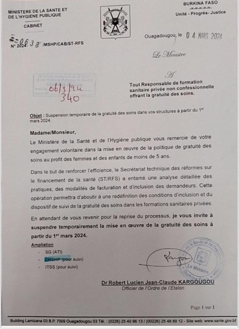 Dans une note en date du 4 mars 2024, le ministère en charge de la santé invite les responsables des formations sanitaires privées non confessionnelles à suspendre temporairement la mise en œuvre de la gratuité des soins au profit des femmes et des enfants de moins de 05 ans, à partir du 1er mars 2024.